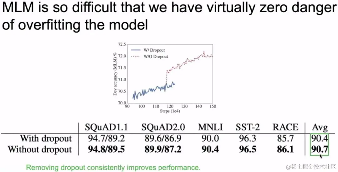 ALBERT移除dropout对精度提升非常小,但是在训练的时候显著减少了内存的使用。