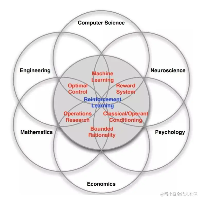 机器学习是个跨学科的研究领域,而 RL 则是其中跨学科性质非常显著的一个分支。RL 理论的发展受到生理学、神经科学和最优控制等领域的启发,现在依旧在很多相关领域被研究。在控制理论、机器人学、运筹学、经济学等领域内部,依旧有很多的学者投身 RL 的研究,类似的概念或算法往往在不同的领域被重新发明,起了不同的名字。