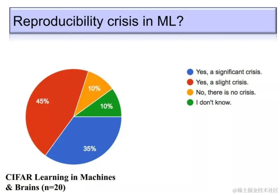 其实,这并非 Precup& Pineau 研究组第一次对 DRL 发难。早在 2 个月前,该研究组就通过充足的实验对造成 DRL 算法难以复现的多个要素加以研究,并将研究成果撰写成文 Reproducibility of Benchmarked Deep Reinforcement Learning Tasks for Continuous Control[9]。同年 8 月,他们在 ICML 2017 上作了题为“Reproducibility of Policy Gradient Methods for Continuous Control”的报告 [10],通过实例详细展示了在复现多个基于策略梯度的算法的过程中,由于种种不确定性因素导致的复现困难。12 月,在万众瞩目的 NIPS 2017 DRL 专题研讨会上,Joelle Pineau 受邀作了题为“Reproducibility of DRL and Beyond”的报告 [11]。报告中,Pineau 先介绍了当前科研领域的“可复现性危机” :在《自然》杂志的一项调查中,90% 的被访者认为“可复现性”问题是科研领域存在的危机,其中,52% 的被访者认为这个问题很严重。在另一项调查中,不同领域的研究者几乎都有很高的比例无法复现他人甚至自己过去的实验。可见“可复现性危机”有多么严峻!Pineau 针对机器学习领域发起的一项调研显示,同样有 90% 的研究者认识到了这个危机。