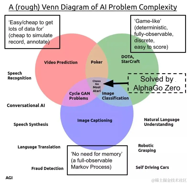 DQN 和 AlphaGo 系列工作给人留下深刻印象,但是这两种任务本质上其实相对“简单”。因为这些任务的环境是确定的、静态的,状态主要是离散的、静态的、完全可观察的,反馈是确定的,代理也是单一的。目前 DRL 在解决部分可见状态任务(如 StarCraft),状态连续的任务(如机械控制任务),动态反馈任务和多代理任务中还没取得令人惊叹的突破。