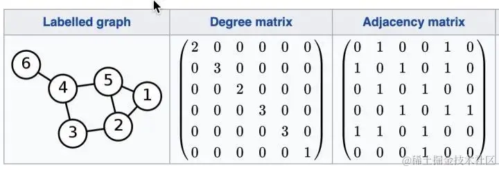 。而其中每一行的和,就是每个节点的度degree。用矩阵表示则为: