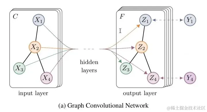 我们可以根据这个GCN的图看到,一个拥有 个input channel的graph作为输入,经过中间的hidden layers,得到