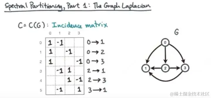 首先我们表示一个graph的方式有很多,我们可以用邻接矩阵,也可以用Incidence matrix。这个matrix 中,每一行表示一个边,每一列表示一个节点。每一行中,边的节点的起点用记为1,边的终点记为-1。我们将这个metrix 记为 . 具体如下图。