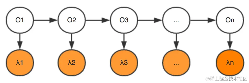 观测独立性假设: 每个字的输出仅仅与当前字有关,即每个λ的值只依赖于其对应的O值,即