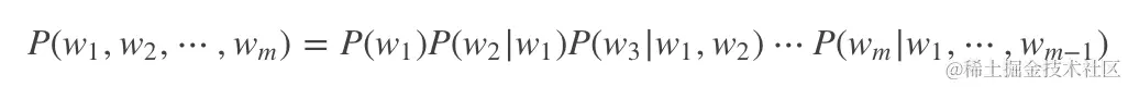 给定一个句子分词后得到的单词序列{w1,w2...wm},语言模型就能计算出这个句子(或者说词序列)存在的可能性: