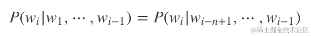 显然,当m取值稍微一大,乘法链的后面几项会变得非常难计算(估计出这几项的概率需要依赖极其庞大的语料才能保证估计误差可接受)。计算困难怎么办?当然是用合理的假设来简化计算,比如我们可以假设当前位置取什么词仅取决于相邻的前面n个位置,即