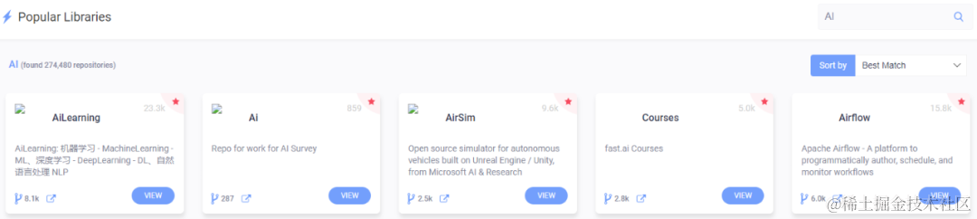 是的,lib4dev 也提供了项目搜索功能。这一点非常好用。例如我搜索“AI”,就会罗列出排行结果了。