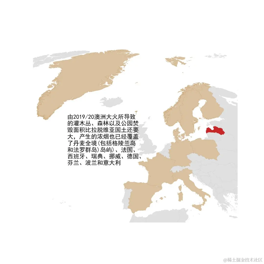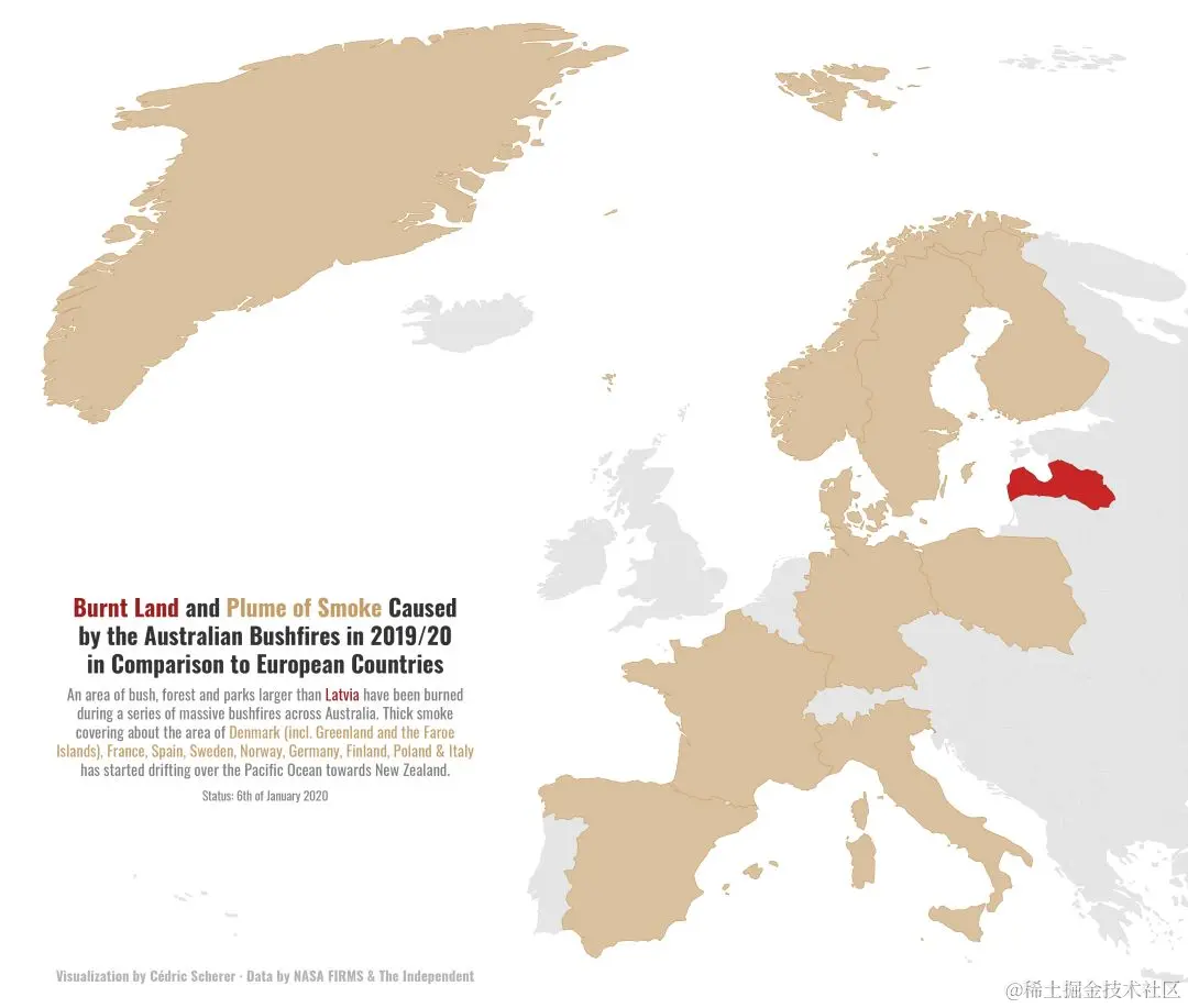 譬如图30来自于Github仓库[5] ,这个仓库包含了众多基于R的优秀作品,而图30就是其中之一,对澳洲大火造成的影响进行可视化: