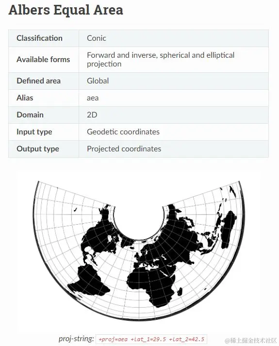 在之前关于坐标参考系的文章中我们了解过绘制地图时投影的重要性,参考超图对绘制中国地图投影选用方面的建议[2],我们使用绘制中国地图常用的Albers Equal Area作为投影,在proj[3]查询到其信息说明:
