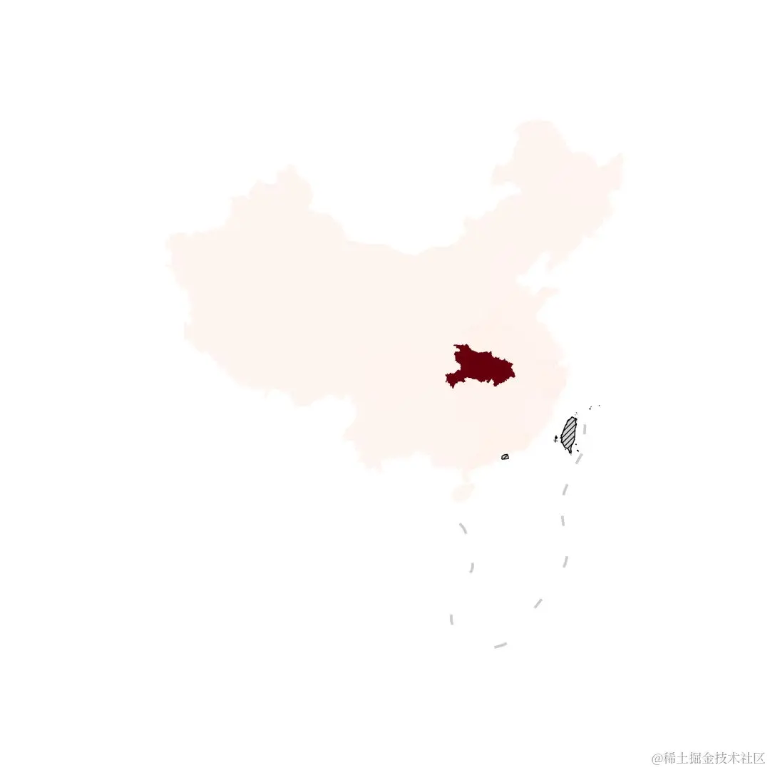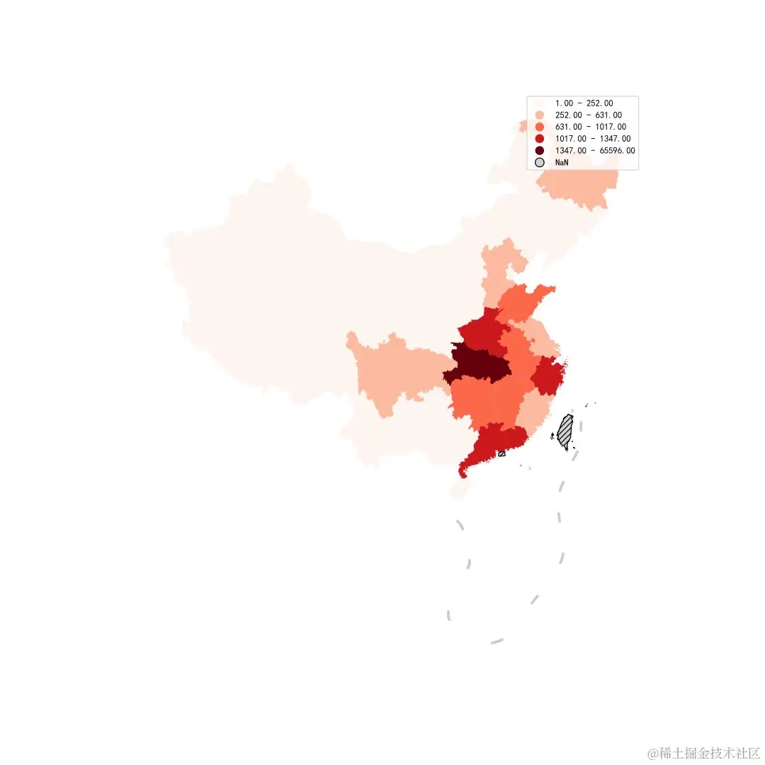 这下我们搞清楚了,原来是因为湖北省的数据过于大,使得数值在均匀向有序色阶上映射时,除湖北省之外的其他数据都被压缩到非常浅色的区域。