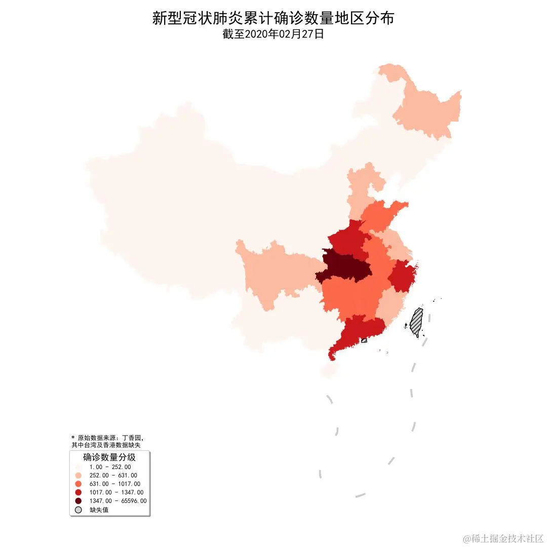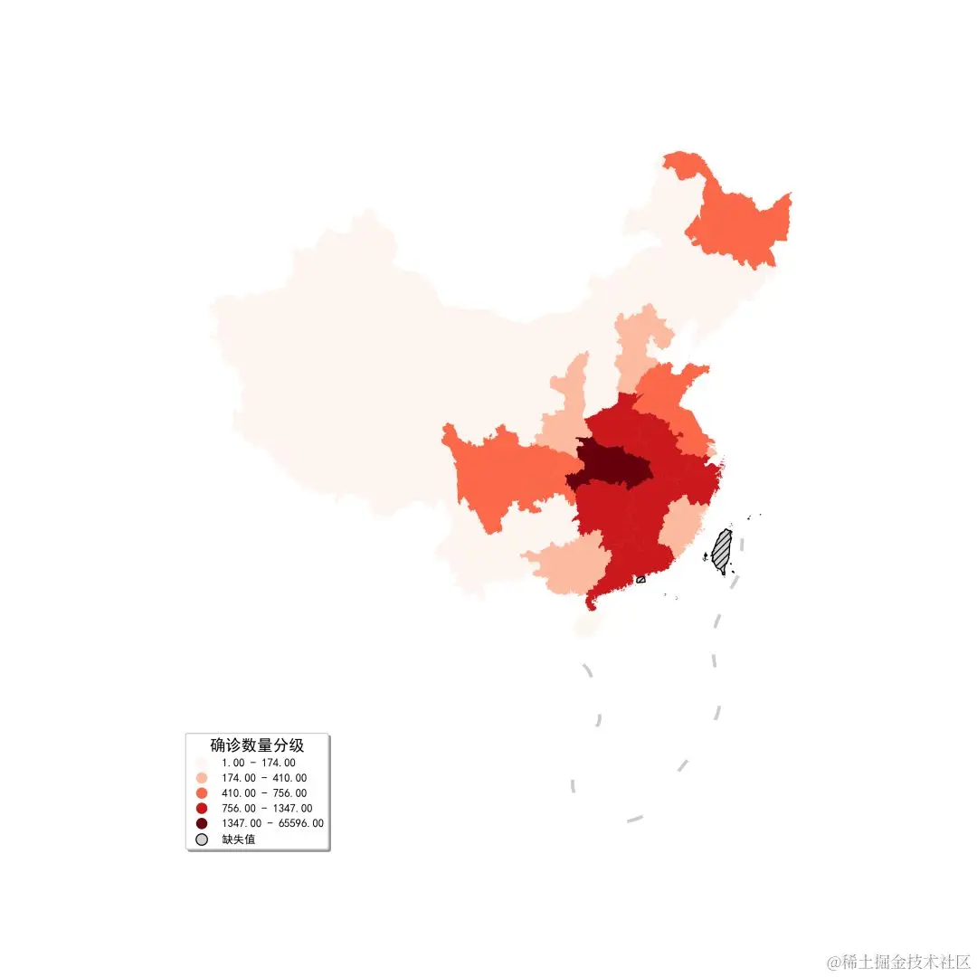 这时可以看到,区域颜色的分布更加温和,也使得我们看出了不同地区在疫情严重程度上的区别。