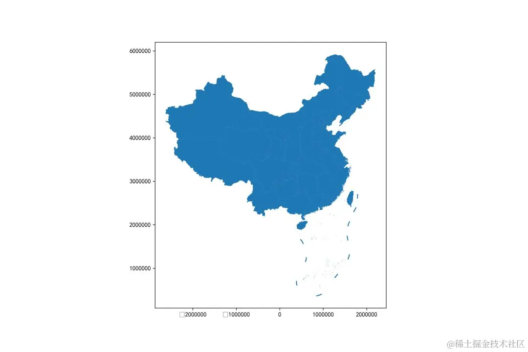 将其proj信息传入to_crs()方法中(注意按照将添加上中央经线105度和标准纬度范围25到47度),统一到所有图层中: