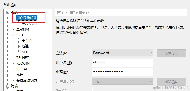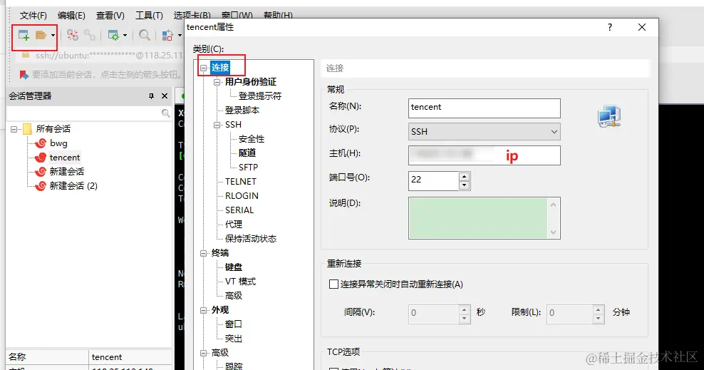 打开 Xshell 工具,点击左上角新建会话,在连接处输入远程服务器的 IP 和 端口号,然后点击用户身份验证,输入账号(一般账户名是 root)密码点击连接即可连接至远程服务器。