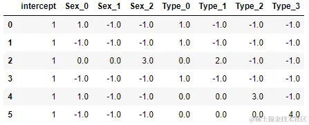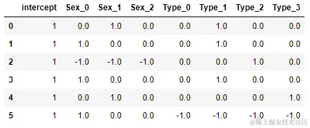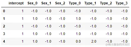 # 变量 Sex => 变为了4个新变量(包含常数项): 'male' => [ 1. -1. -1. -1.];