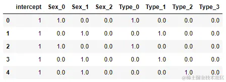 # 变量 Sex => 变为了4个新变量(包含常数项): 'male' => [ 1. 1. 0. 0.];