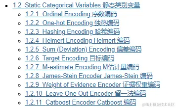 真实世界的数据集还往往包含类别特征。但是由于scikit-learn中的模型只能处理数值特征,因此我们需要将类别特征编码为数值特征但是,很多新的模型开始直接提供类别变量支持,例如lightGBM和Catboost。这里我们使用category_encoders包,因为它涵盖了更多的编码方法。