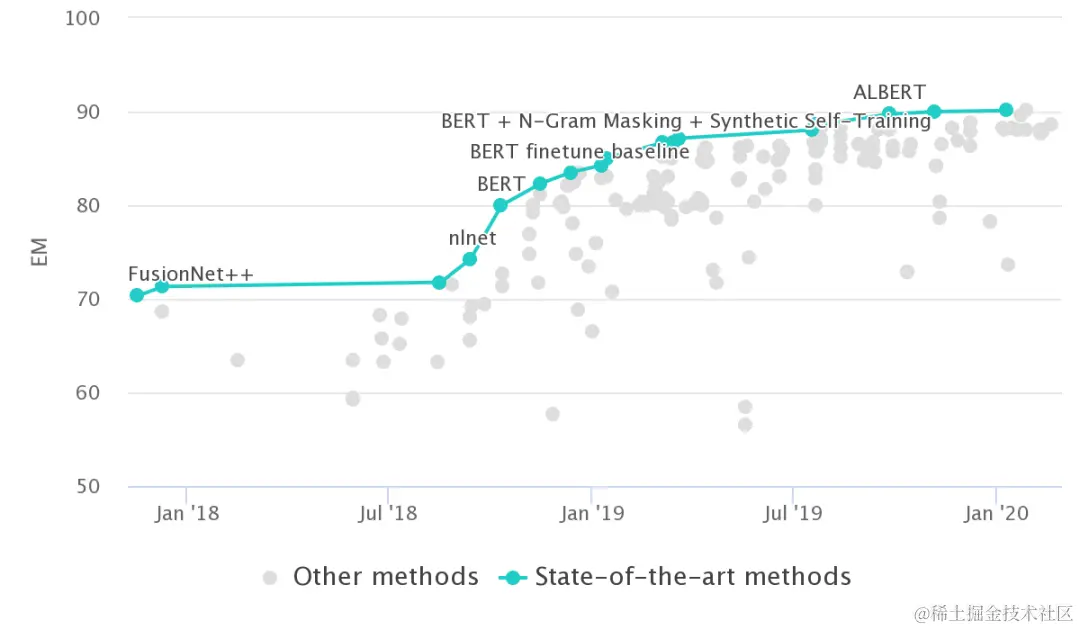 SQuAD2.0SOTA水平趋势图,来自paperswithcode