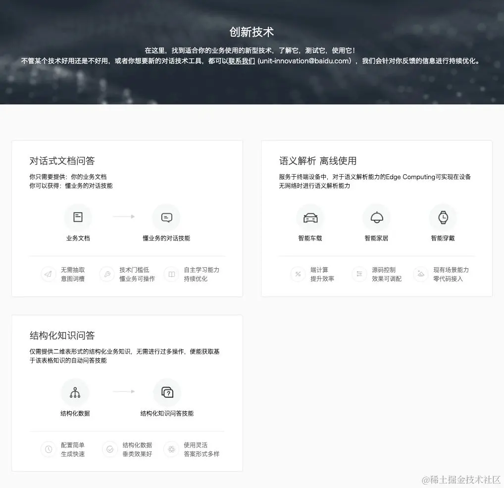 百度UNIT“创新功能”页面,包含了文档问答