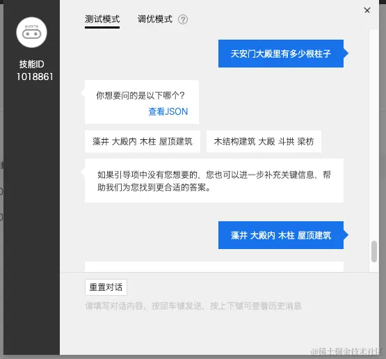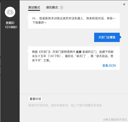 为了让大家可以快速测试,我们在公众号后台绑定了这个天安门知识问答机器人,欢迎大家关注我们进行体验。UNIT研发环境每天请求次数有限,大家先测先得。