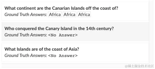 SQuAD2.0问题及答案样例,包含了不可回答问题