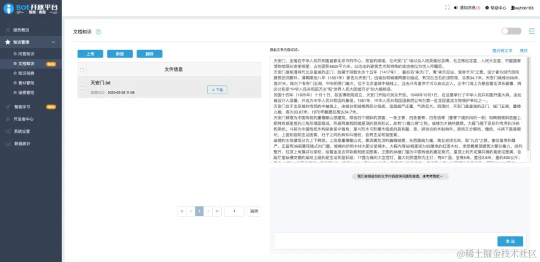 而小i的Bot开放平台将文档知识作为知识管理的一个栏目,并且非常明显地标上了Beta图标。操作方式也同样简单,上传文档即可开始测试。与百度不同的是整个过程甚至无需训练。
