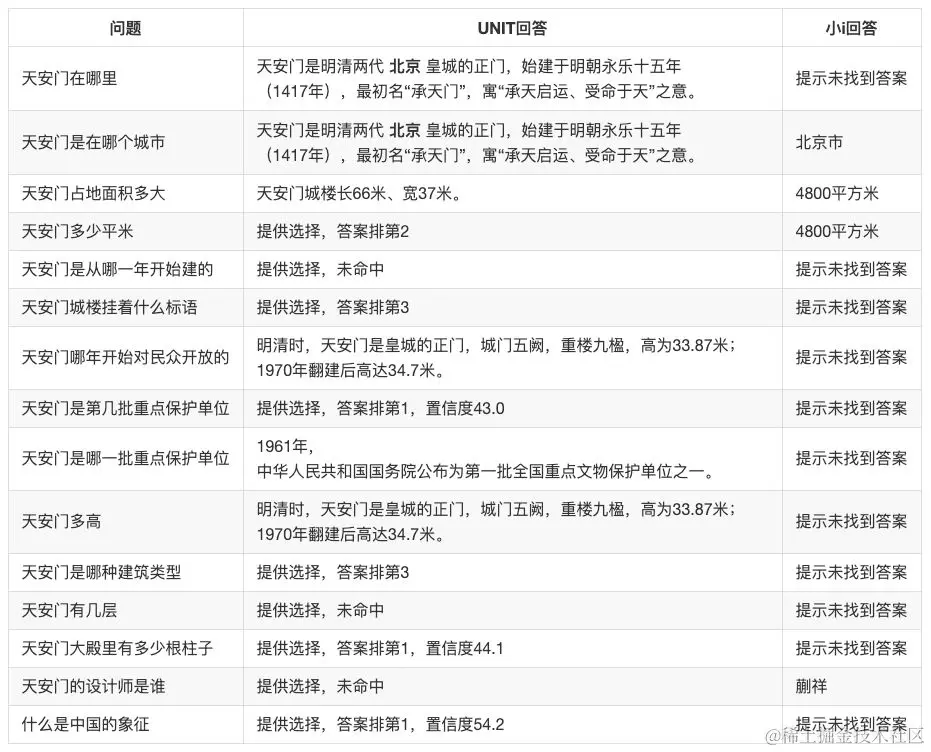 本次我们从百度百科的天安门词条[4]选取了一些文字作为文档。文档不长,一共500余字,包括了较大量的数字信息。针对这段文档,我们仿照SQuAD数据集人工整理了15道可回答问题和5道不可回答问题来对两家的算法进行测试。为了给大家一个直观的印象,在此摘抄第一段: