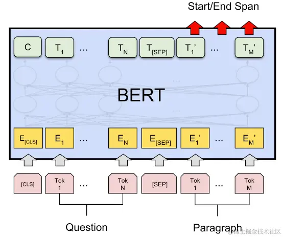 BERT 运用于阅读理解问题的示意图
