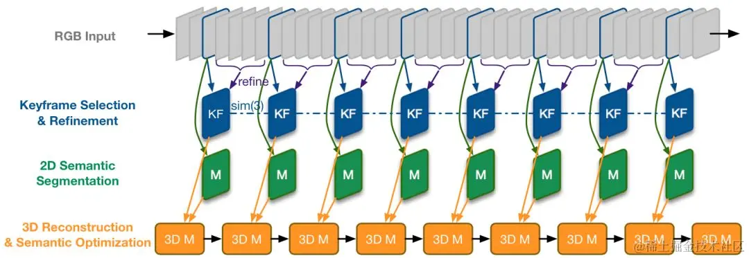 流程:输入 -> 选关键帧并 refine(非关键帧用于增强深度估计)-> 2D语义分割 -> 语义优化+3D重建