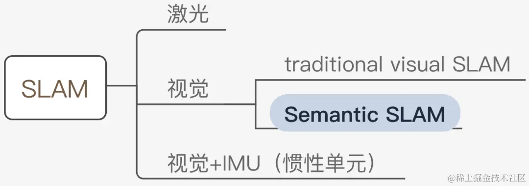 Semantic SLAM 是研究者试图利用物体信息的方案,其在Deep Learning的推动下有了较大的发展,成为了相对独立的分支,其在整个SLAM领域所处位置如下图: