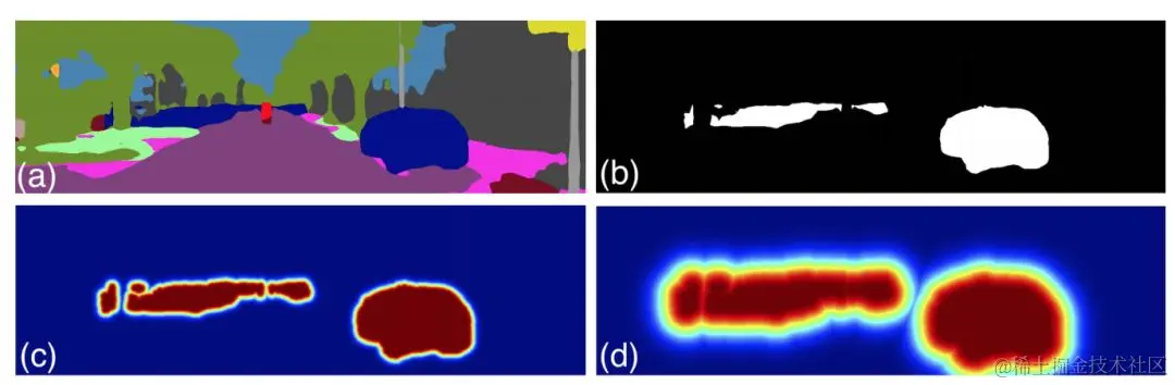 如上图所示,(a) 为语义分割图,(b) 为类别 “Car” 的区域,在(c) (d) 中,根据与 Car 区域的距离,概率值从1 (红) 变为 0 (蓝)。其他类别如Tree,也会产生此概率分布图。