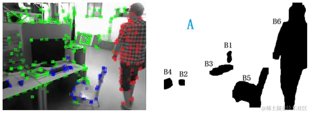前者有利于确定物体是否真的在运动,因为单个特征点的偏移并不能确定运动的发生(可能是 SLAM 系统一直存在的观测噪声),若是一群有关联的特征点普遍发生了较大的偏移,就可以断定为是动态的。