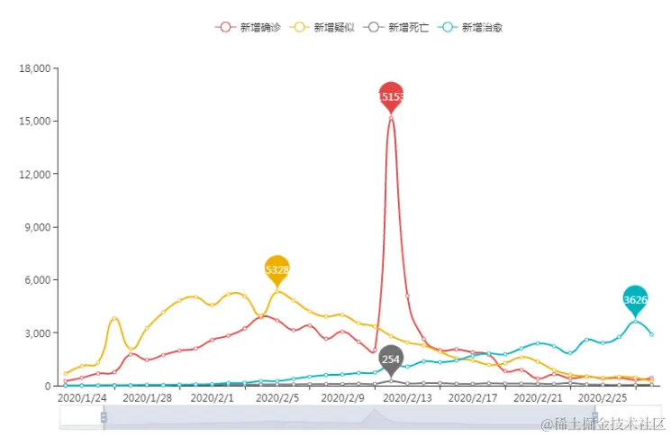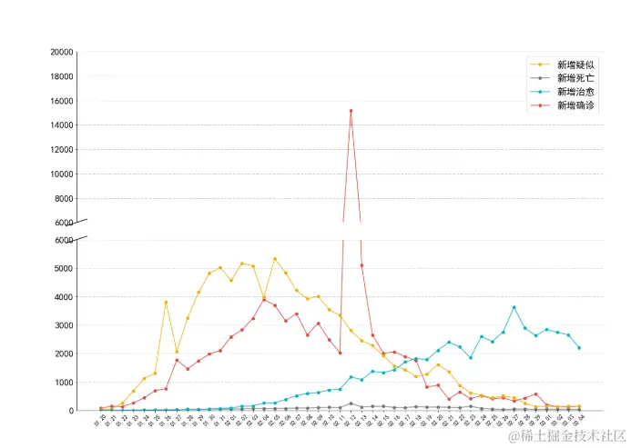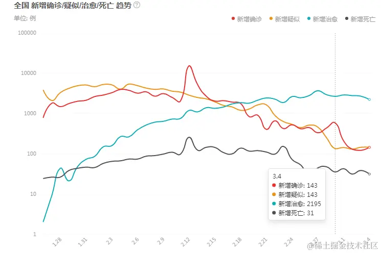 数据分析视角: 由于存在一个离散点,使得折线图其他部分的视觉上波动不明显,不易于发现数据规律。但是由于面向对象是普通大众,这种展示方式比较符合大众思路,而且由于是疫情信息,每多做一种变换处理,都有可能带了不确定的政策风险,这种思路比较稳妥。