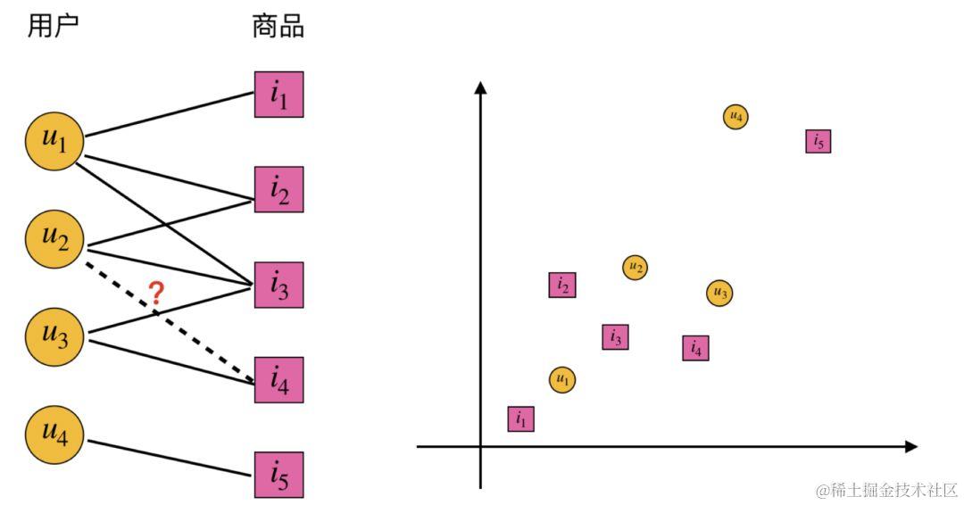 以电商平台的推荐为例,推荐系统的核心数据在于用户 - 商品交互的二部图,而基于神经网络的多数方法将二部图中的实体映射到一个合适的向量空间中去,使得在图上距离越近的两个实体在向量空间中的距离也越近,如下图所示: