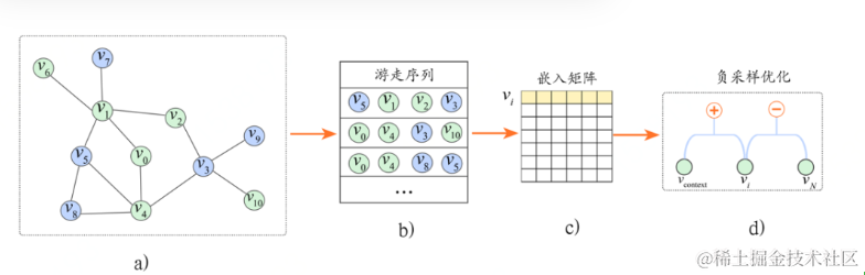 DeepWalk 通过随机游走将图转化成节点序列,设置中心节点左右距离为 w 的节点为 上下文 ( context ),如图 2b 所示。同词向量方法一样,DeepWalk 本质上建模了中心节点与上下文节点之间的共现关系,这种关系的学习也采用了负采样的优化手段,如图 2d 所示。