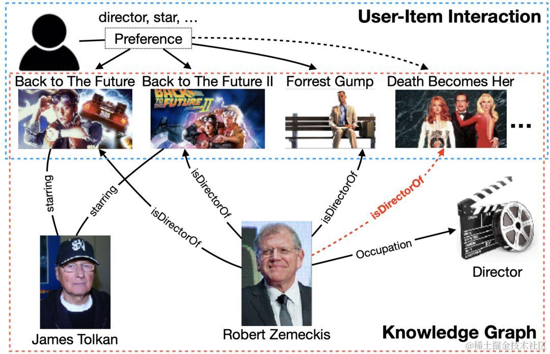 GNN 本身是一种深度模型,与推荐系统结合之后,多层 GNN 模型可以更好地捕捉用户与商品之间的高阶协同关系,论文“Neural Graph Collaborative Filtering”中,作者论证了多层 GNN 所带来的“Deep”与“High order”效益对推荐质量的有效提升。除了推荐系统算法模型本身的研究,另一种思路在于如何使推荐系统有效融合进额外的信息,如用户端社交网络的信息、商品端商品知识图谱的信息。这类信息中通常也蕴含了极强的关系,因此可以非常自然地与用户 - 商品二部图合在一起构成一个更大的异构图。下图给出了与电影知识图谱的结合示意图: