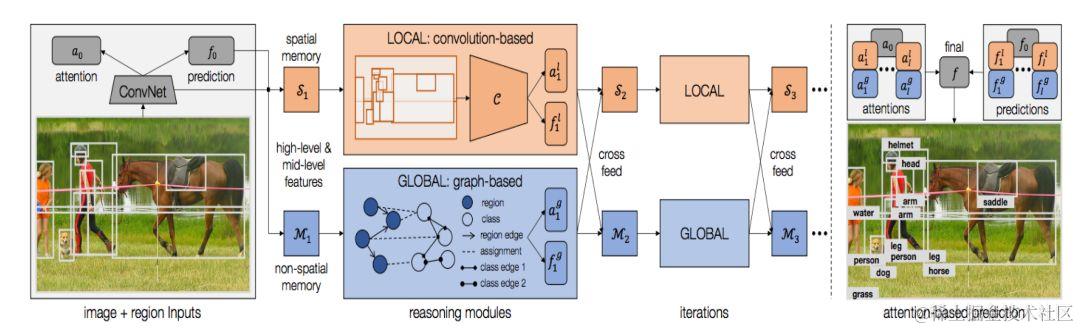 推理通常不是一步到位的,而是迭代式的。为了将前一轮的信息传递到后一轮,可以使用记忆模块,局部推理和全局推理使用不同的记忆模块和,每次迭代得到的输出用于更新记忆模块。另外模型还引入了注意力机制,以便融合当前预测值与来自其他迭代过程产生的预测值。模型在不同的训练数据集上进行试验,将识别效果对比卷积神经网络提升了3.7% ~ 8.4%。