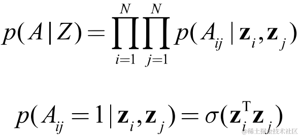 这里也简单使用了两个节点表示向量的内积来拟合邻接关系。