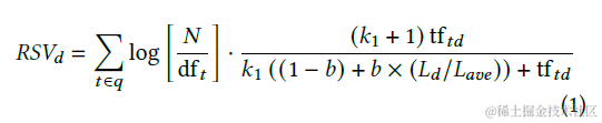 在召回步骤中,我们使用Okapi BM25来衡量查询和文档之间的词汇相似度。计算公式如下: