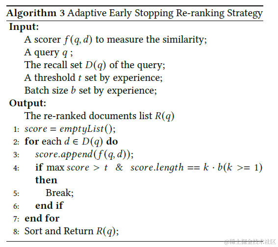 如图3所示,最高分的分布与图2不同。如果在重排序过程中采用算法2,则如果不相关的文件的得分大于正数,则我们可能会误将不相关的文件检索为正确文件。误报文件高于阈值。为了缓解这种问题,我们提出了一种自适应的提前停止重新排序策略,如算法3所示。我们相信基于经验的批处理大小????atch size可以减少假阳性文档,并获得 增益(排行榜的指标)。