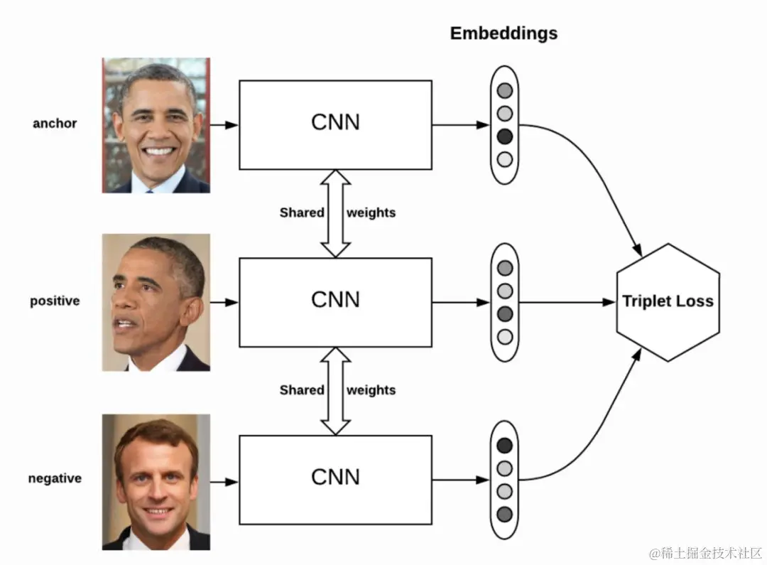 重申一下,Siamese网络的目标是确保一个特定的人的图像(锚点)与同一个人的所有其他图像(positive)的距离要比与任何其他人的图像(negative)的距离更近。