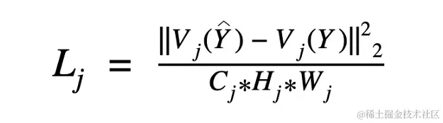 其中,V_j(Y)表示VGG网络第j层在处理图像Y时的激活情况,其形状为(C_j, H_j, W_j)。我们使用L2损失的平方,根据图像的形状归一化,比较了ground truth图像Y和预测图像Y^的激活情况。\