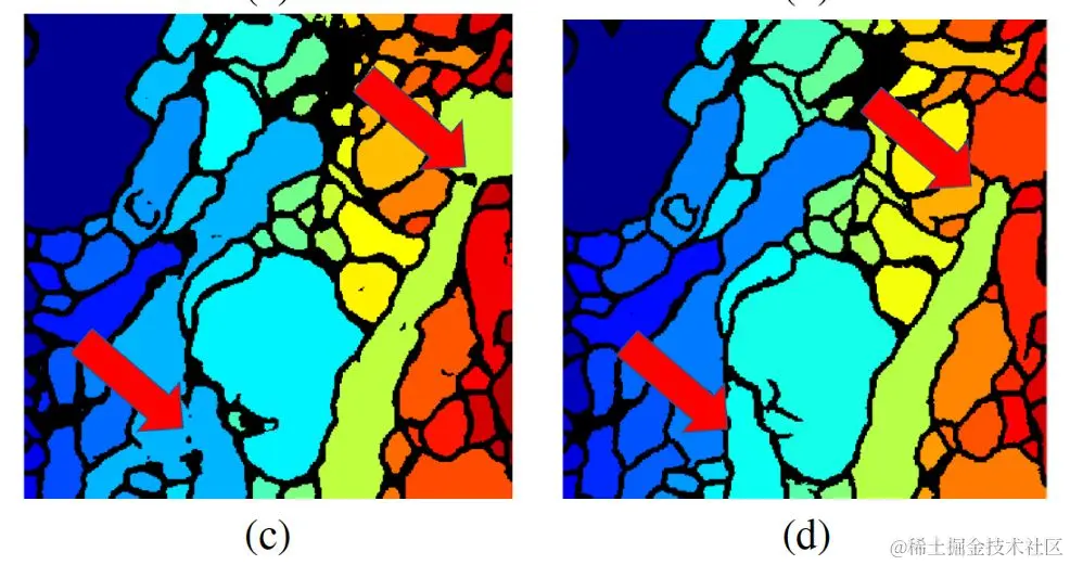 (c)使用像素级丢失检测神经元膜后获得的分割,(d)利用拓扑损耗检测细胞膜后得到的分割\