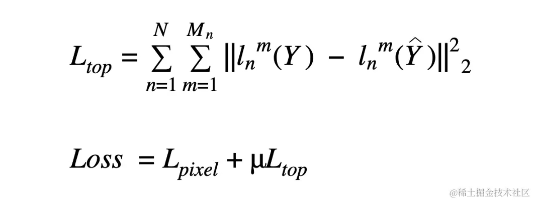 这里,在RHS上,l(m,n)表示VGG19网络第n层的第m个feature map。Mu是衡量像素损失和拓扑损失相对重要性的标量。\