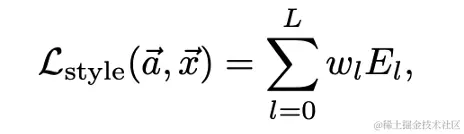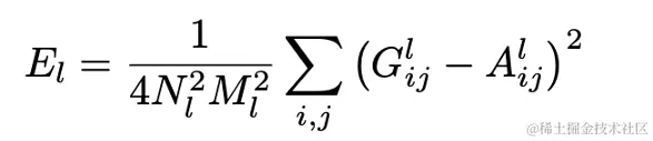 这里,G^l^和A^l^分别是模型输出的l层和目标图像的l层的风格样式表示。N~l~是层l中不同特征映射的数量,M~l~是层l(i)中特征映射的容量(也就是通道的宽和高)。最后,E~l~是图层l的纹理损失。\