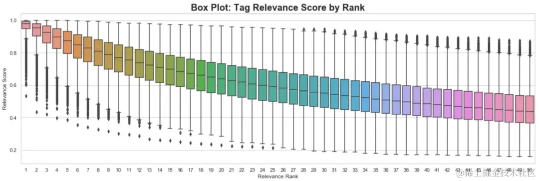 接下来,我们在下面的图中确认,电影的高排名标签往往具有较高的中值相关性得分。电影的排第一个的标签的中值相关度几乎是1。我们可以看到,当我们下降到第50位时,中值相关性得分逐渐下降。