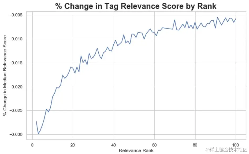 下面的图显示了从第1个标签到第100个标签的中值的变化百分比。当相关性得分开始变得更稳定时,我们看到在第50位附近有一个拐点。因此,我们可以选择N=50作为每个电影保留的合理数量的标签。注意,这是一个相当简单的“拐点方法”风格的方法,可以在以后进行优化。