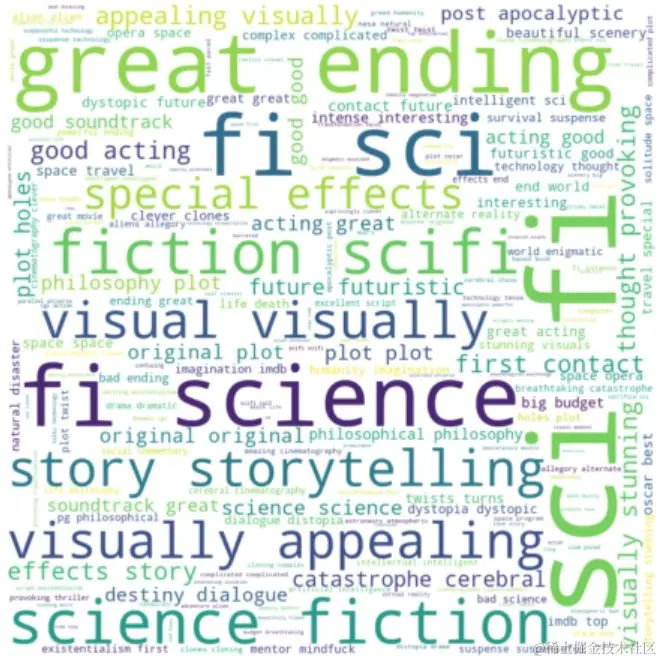 为了进一步说明Jaccard Index的有效性,请看下面基于和Interstellar相似的电影的标签频率的词云。在这里,我们可以看到哪些标签在相似性计算中更加突出(例如科幻小说,伟大的结局,反乌托邦的未来,哲学,大脑)。