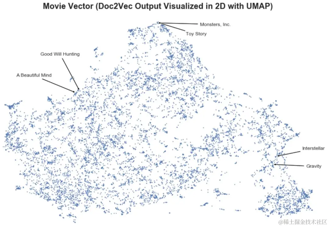 下面我用UMAP在二维空间上可视化电影向量,这是一种流行的非线性降维技术。我们可以看到,在这个向量空间中距离较近的电影更加相似(例如Toy Story和Monsters等等)。