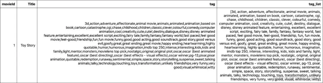 现在我们可以得到每个电影的前50个标签的列表,我们将在下一节中使用它们。例如,Toy Story的前50个标签如下。\