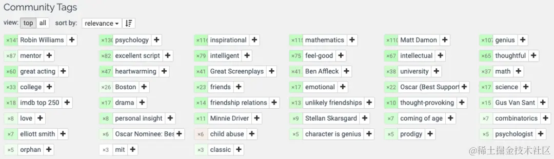 幸运的是,即使没有足够的观看数据,我们仍然可以建立一个像样的电影元数据推荐系统。这就是MovieLens的作用所在。MovieLens提供了一个公共数据集,其中包含每个电影的关键字标签。这些标签信息量很大。例如,看看Good Will Hunting的最重要的社群标签。